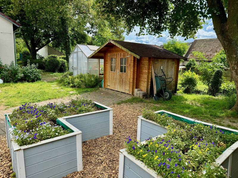 Der Platz hinter der Mensa - von den Kindern auch „Feuerteufel“ genannt - ist mit einem Sonnensegel und einer Outdoortafel ausgestattet. So können einzelne Klassen in der wärmeren Jahreszeit kleine Lerneinheiten draußen abhalten. Rund um den „Feuerteufel“ ist unter Mithilfe des Fördervereins und der tatkräftigen Unterstützung der Eltern ein Schulgarten zu neuem Leben erweckt worden.