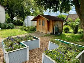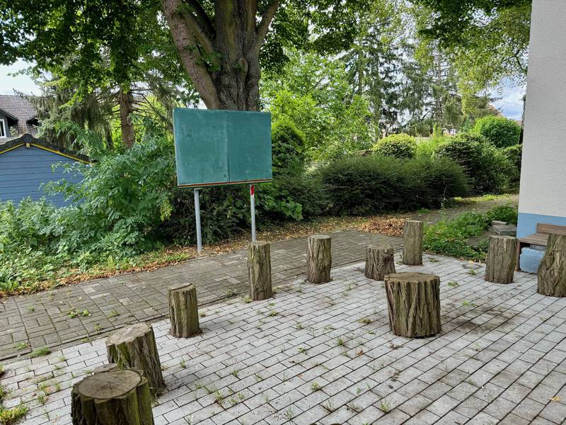 Hinter dem Altbau ist im Schatten der Bäume ein zweites grünes Klassenzimmer entstanden, wo eine Klasse im Kreis auf Baumhockern zusammen lernen kann. Auf einer alten Schultafel können sogar Ergebnisse festgehalten werden.